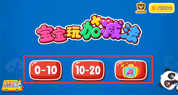 1、首頁設置0-10、10-20加減法學習板塊與音樂板塊,界面充滿童趣,還設有會員中心、家長中心入口,助力寶寶趣味學習加減法。