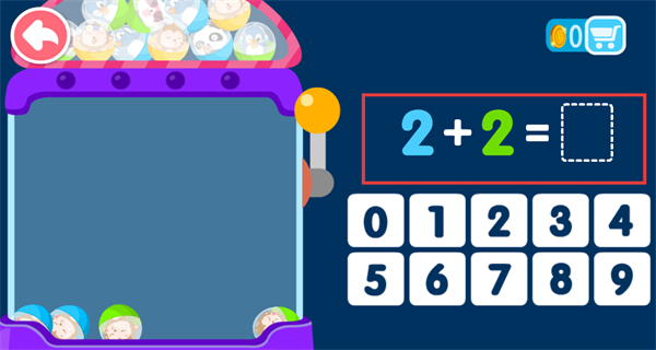 3、10-20加減法板塊展示2+2算式,搭配扭蛋機卡通場景,下方數字鍵盤方便寶寶答題,讓寶寶在趣味互動中學習加法運算。
