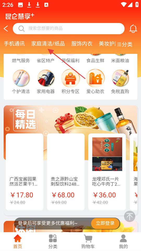1、打開APP后,進入首頁,在分類欄找到目標品類如家庭清潔/紙品、米面糧油等,點擊進入對應分類頁面。