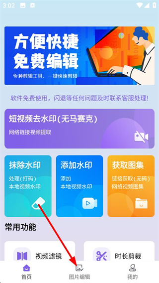 1、進入工具首頁可看到多種編輯功能選項,點擊底部圖片編輯選項,可進入圖片編輯功能頁面,使用圖片相關的編輯工具。