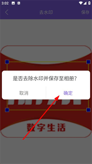 4、完成水印去除后會彈出確認提示框,點擊確定按鈕,即可將去除水印后的圖片保存至相冊,完成整個圖片去水印流程。