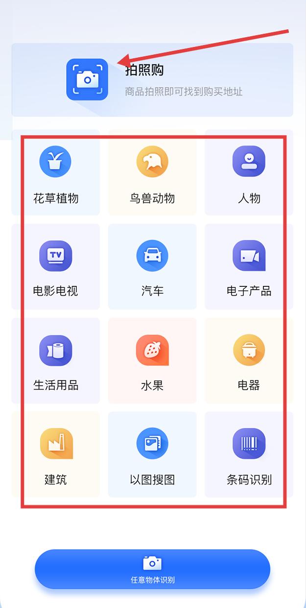 1、萬能識別板塊豐富,花草植物、鳥獸動物等人事物類,電影電視、汽車等物品類,建筑、以圖搜圖等功能齊全,還有拍照購幫找商品。