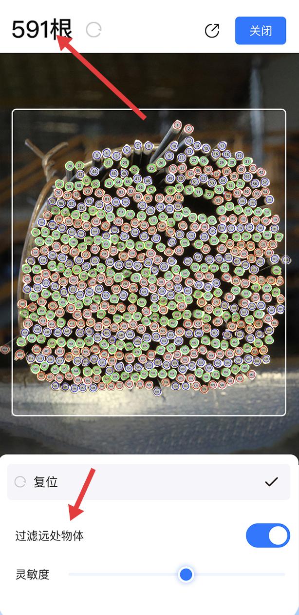3、計數功能精準,對準電纜等物體掃描,界面實時顯示數量,下方可調節過濾遠處物體及靈敏度,輕松應對密集物品計數,智能識別高效便捷。