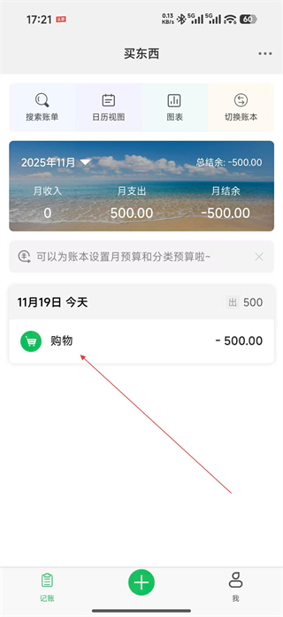4、在買東西賬本頁面,查看11月19日的購物支出記錄,金額為500,同時可查看月支出月結余等匯總數據,管理該賬本的收支情況。