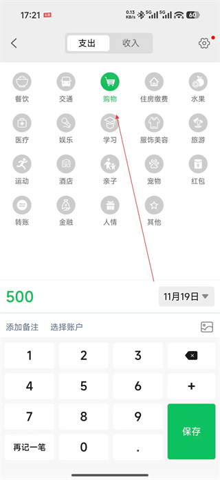 3、進入記賬頁面,選擇支出分類下的購物選項,輸入金額500,選擇日期為11月19日,可添加備注選擇賬戶,完善記賬信息。