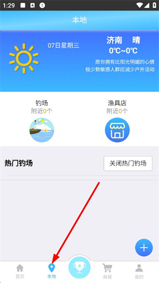 2、點擊本地選項,可查看濟南的天氣情況,了解附近釣場、漁具店數量,還能查看熱門釣場信息,方便用戶尋找合適的釣魚地點。