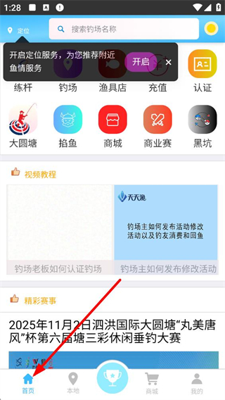 1、首頁可搜索釣場名稱,使用練桿、釣場、漁具店等功能,還能觀看視頻教程、了解精彩賽事,滿足釣魚愛好者的多種需求。
