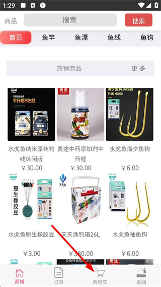 3、進入商城可搜索商品,瀏覽魚竿、魚漂、魚線、魚鉤等分類商品,查看熱銷商品,還能使用購物車功能,方便用戶選購釣魚裝備。