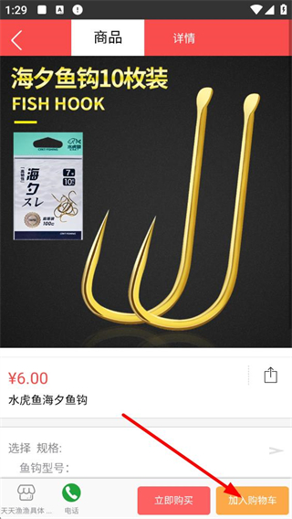4、商品詳情頁,可查看商品價格、規格等信息,選擇立即購買或加入購物車,方便用戶購買心儀的釣魚商品。