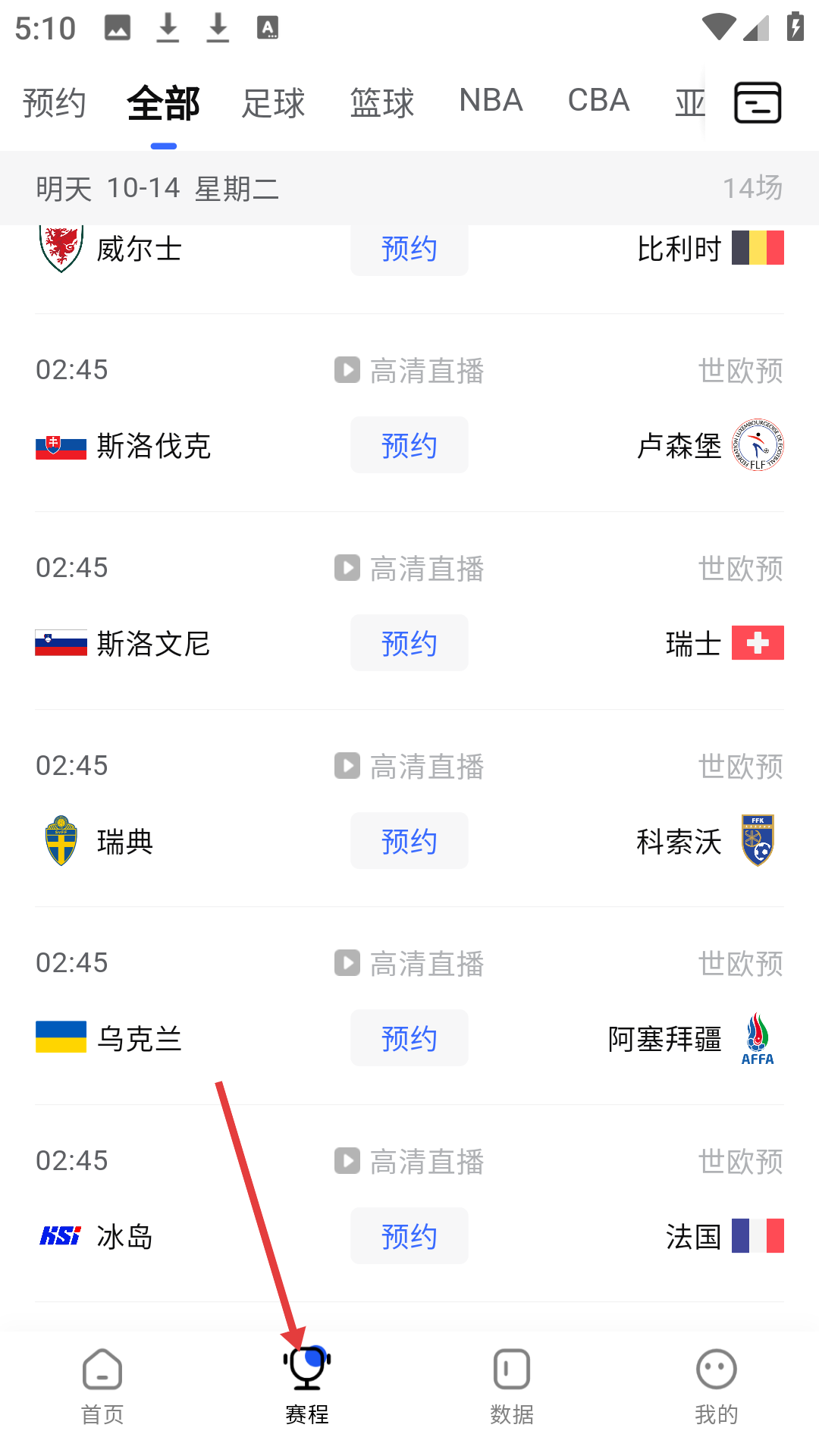 2、賽程頁面可查看足球、籃球等賽事安排,如明天10月14日威爾士對陣比利時等多場世歐預比賽支持預約高清直播。
