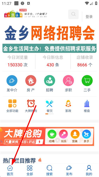 1、進入金鄉生活網APP首頁,可參與金鄉網絡招聘會,使用發中介、房產、招聘、求職等功能,還有大牌搶購、餐飲、家政等服務入口,查看熱門欄目推薦。