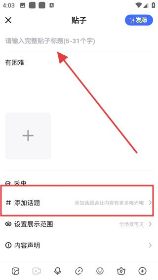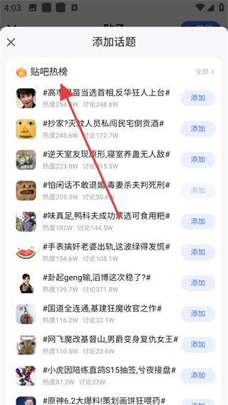 3、輸入完整的帖子標題,然后點擊添加話題選項,進入添加話題頁面,選擇合適的貼吧熱榜話題。