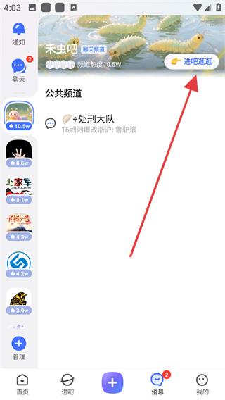1、打開百度貼吧軟件,進入消息頁面,找到逛吧逛逛選項,點擊進入相關貼吧內容頁面,瀏覽貼吧動態。