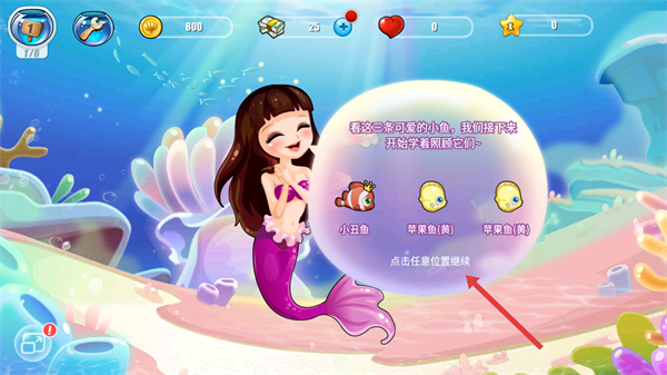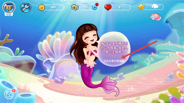 1、會有魚公主茜茜熱烈歡迎,點擊任意位置可繼續,開啟神奇的開心水下之旅。