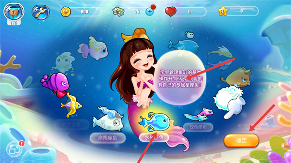 2、會了解到要學會管理魚缸的魚,通過操作升級擁有專屬星座魚,點擊確定繼續游戲。