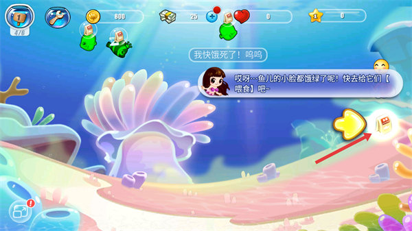 4、之后若魚兒小臉發綠快死了,就去給它們喂食,界面會有提示引導操作,保障魚兒健康。