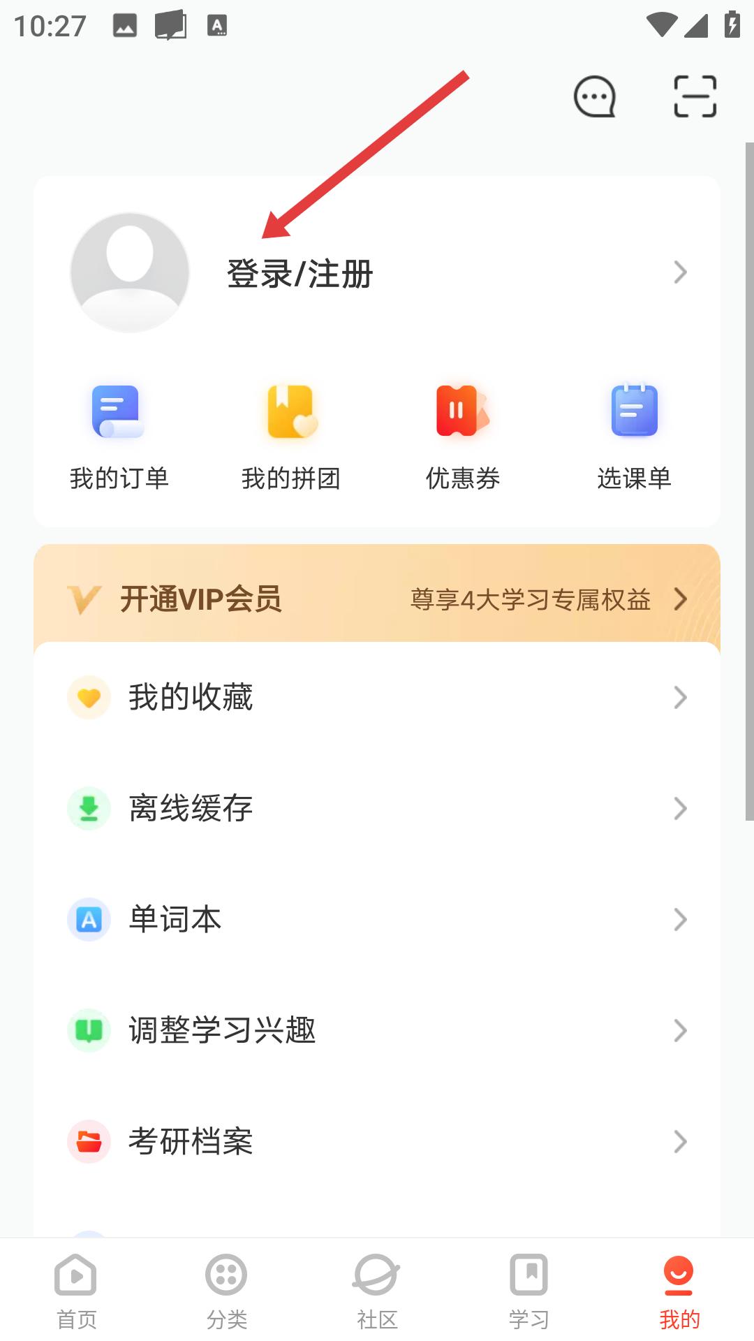 1、進入我的頁面,點擊登錄注冊,完成賬號登錄后,可管理訂單收藏等個人學習內容。