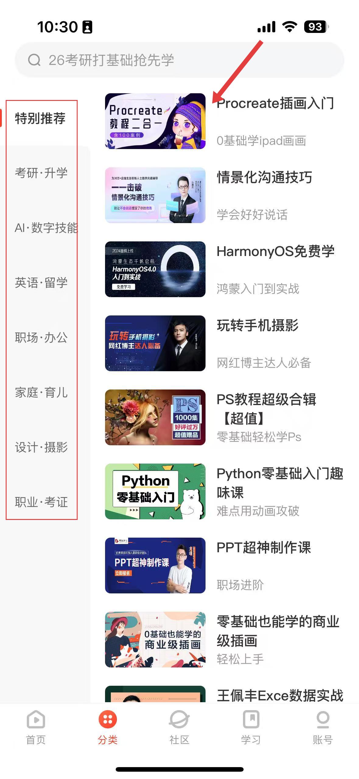 2、在分類頁,選擇感興趣的課程類別,如設計攝影,點擊課程進入詳情頁查看介紹。
