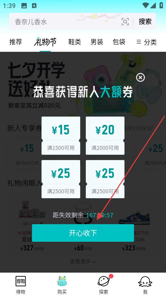 1、打開得物APP,進入禮物節頁面,找到新人專享券區域,點擊立即領取按鈕,獲取新人大額券,查看券面使用規則。