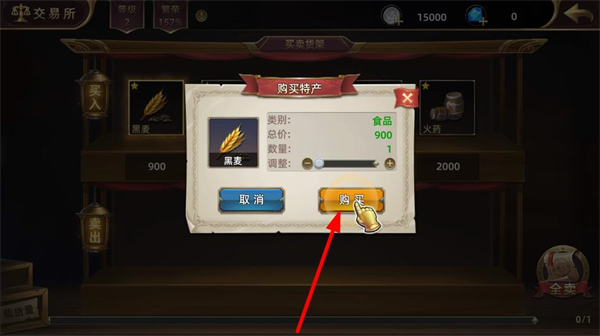 4、在交易所可購買黑麥等特產,選擇數量后點擊購買按鈕完成交易,通過買賣貨物參與航海貿易。