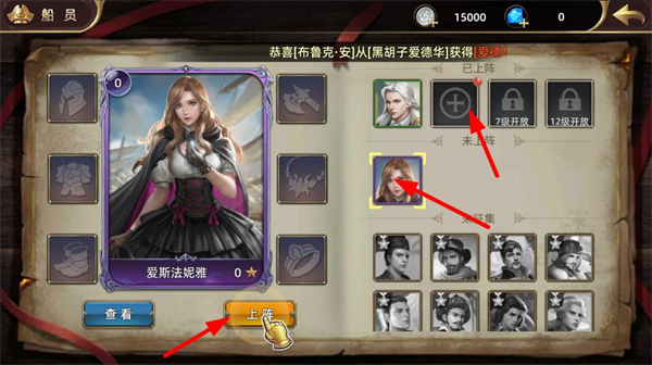 3、有船員系統,可查看愛斯法妮雅等船員信息,進行上陣操作,還能解鎖新船員,組建自己的航海團隊。