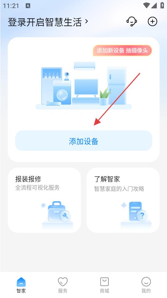 1、進入智慧生活APP智家頁面,看到添加設備入口,按照提示選擇設備類型,準備好設備配網所需信息,如WiFi賬號密碼,進入設備添加流程完成連接。
