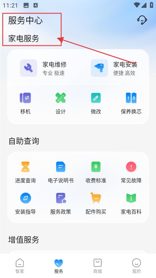 2、切換至服務頁面,找到服務中心板塊,點擊家電服務選項,依據需求選擇家電維修、安裝等服務,填寫家電故障或安裝詳情提交需求。