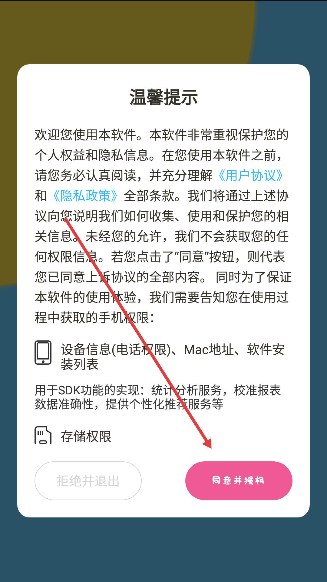 1、下載安裝完成后進入,需在用戶協議和隱私政策界面點擊同意,接受相關條款后才能進入應用。