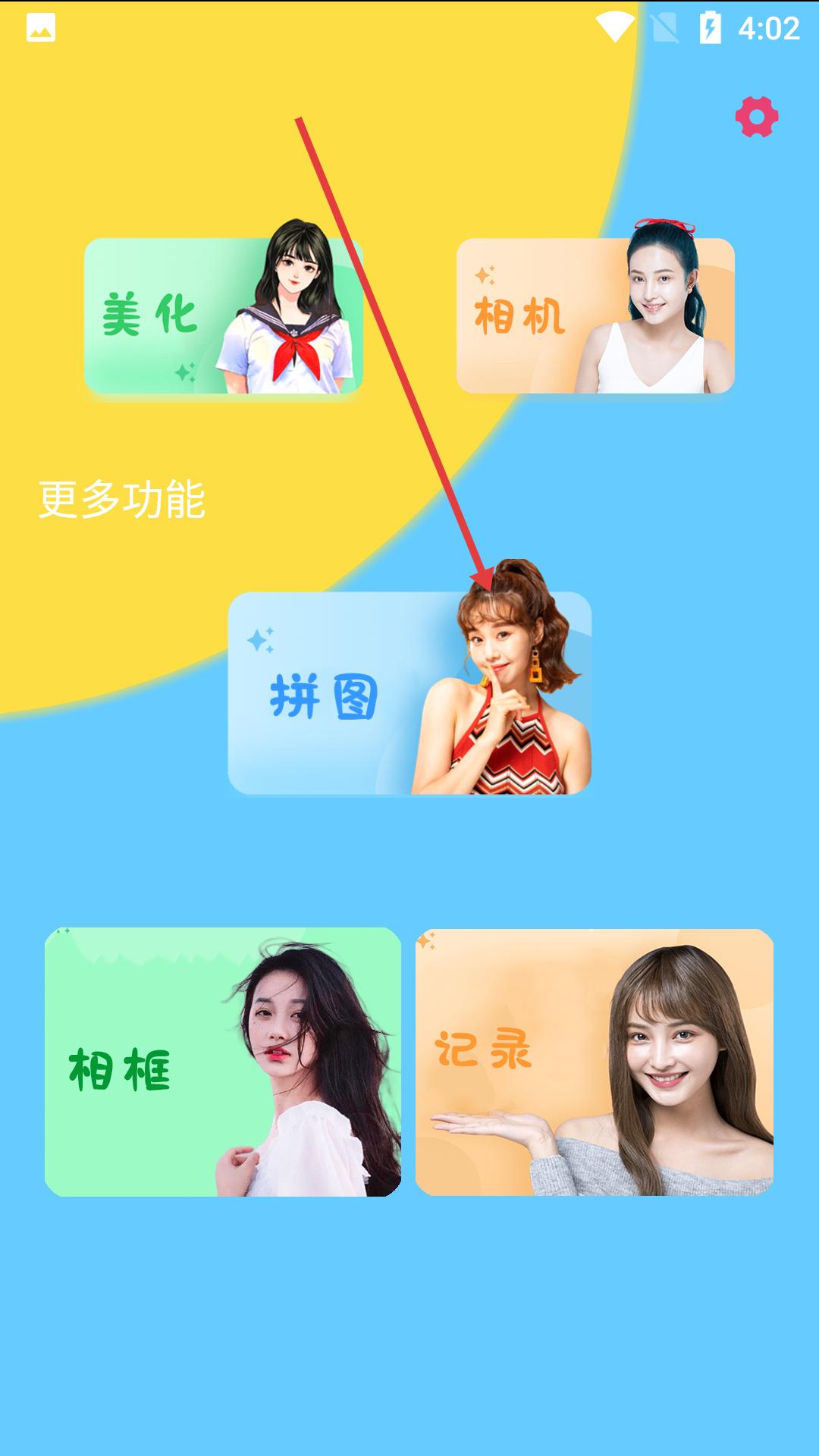 2、該圖片處理軟件主界面有多種功能選項,如美化、相機、拼圖等,點擊拼圖可進入圖片選擇頁面進行拼圖操作。