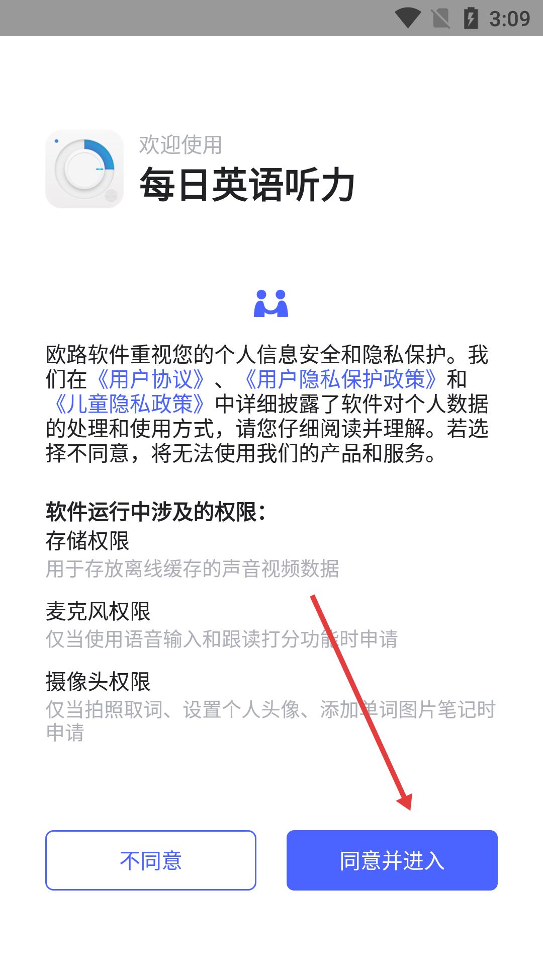 1、下載安裝完成后進入,需在用戶協議和隱私政策界面點擊同意,接受相關條款后才能進入應用。