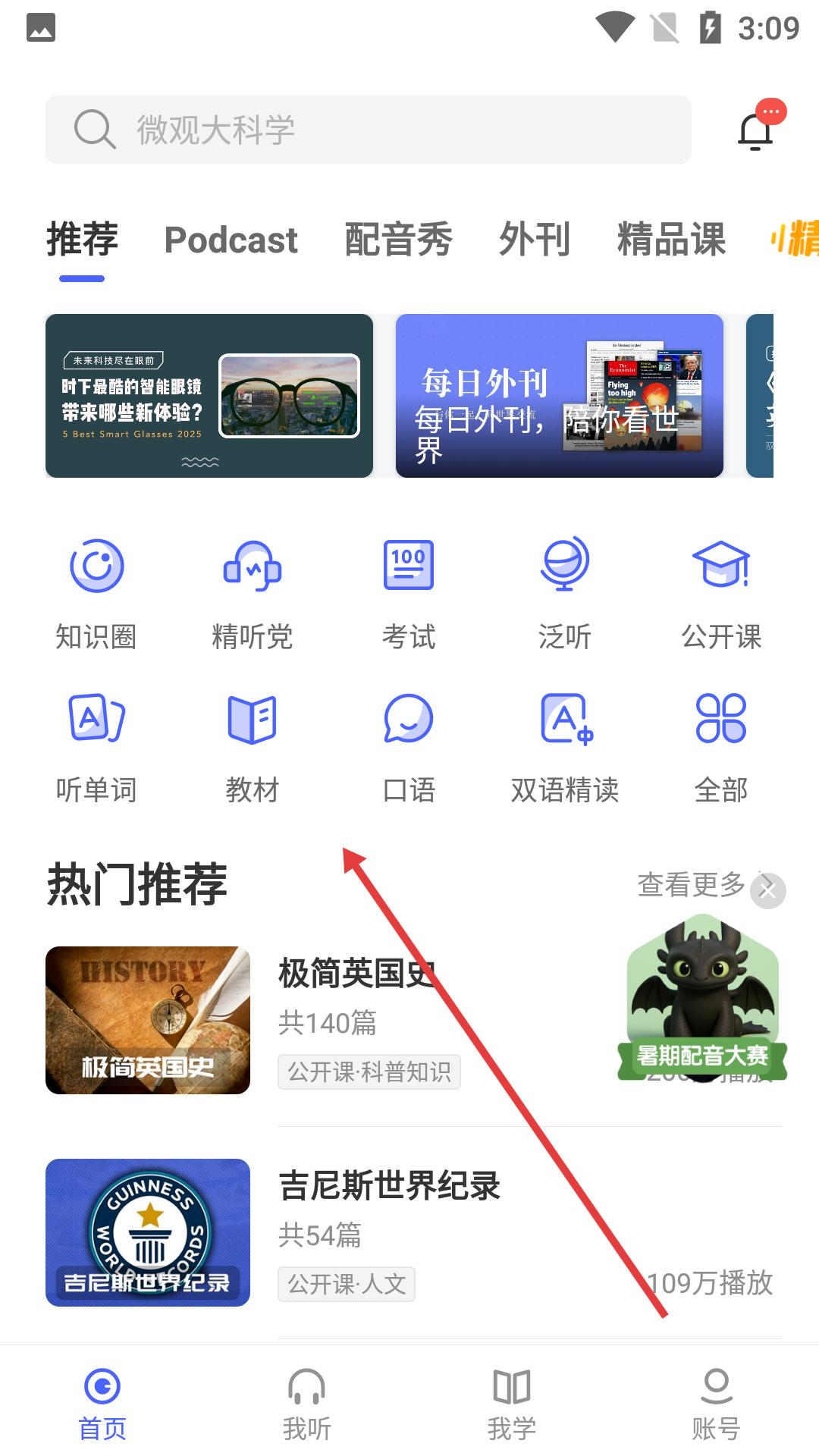 2、在每日英語聽力APP首頁,設有知識圈、精聽黨等多種功能入口,還有熱門推薦內容,滿足用戶多樣的英語學習需求。