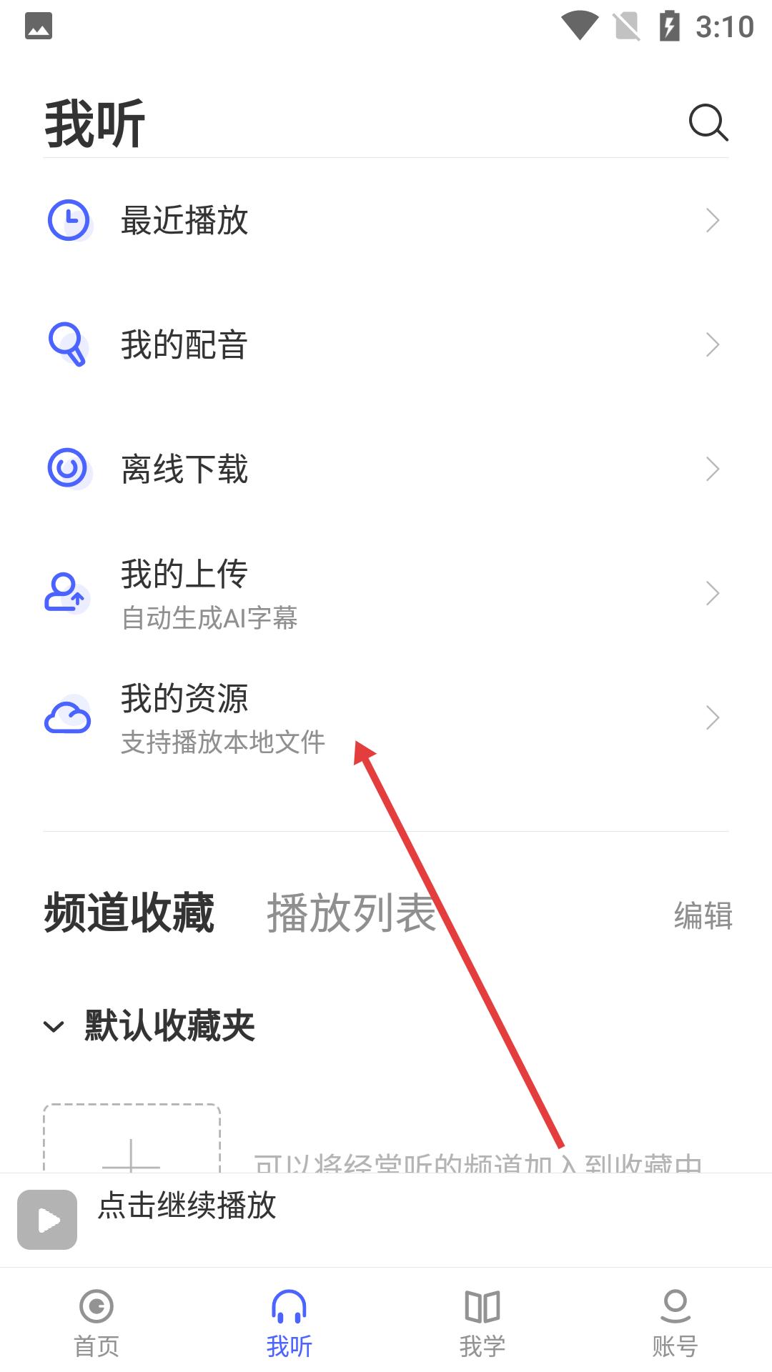 3、進入每日英語聽力APP我聽頁面,可查看最近播放、我的配音等內容,還能管理離線下載及個人上傳等資源。