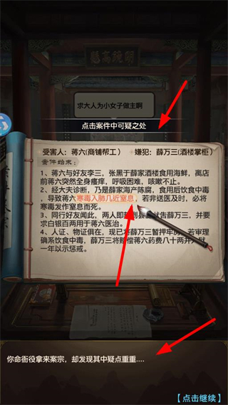 2、查看案件卷宗,按照提示點擊可疑之處,發現案件疑點重重,隨后命衙役拿來案宗,進一步梳理案件線索。