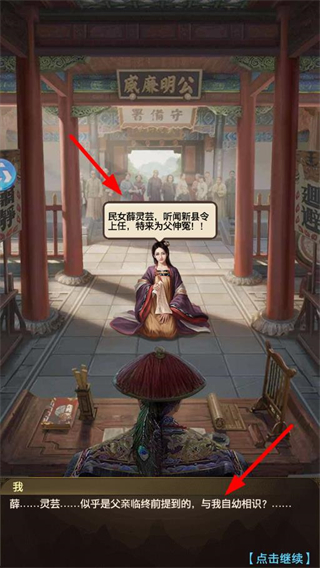 1、看到民女薛靈蕓前來伸冤,自稱是新縣令父親舊識,你需通過對話了解案件背景,開啟本次斷案流程。