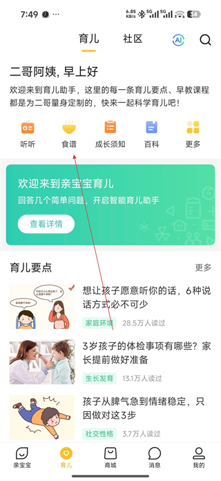 2、登錄后進入育兒頁面查看食譜等功能入口,瀏覽育兒要點內容,可選擇感興趣的育兒知識文章,了解適合兒童的溝通方式等信息。