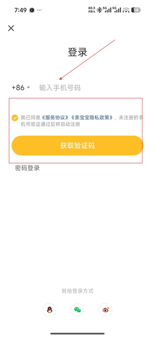 1、進入登錄頁面,輸入手機號,勾選同意服務協議與隱私政策,點擊獲取驗證碼,完成驗證后即可登錄軟件,進入育兒相關功能界面。