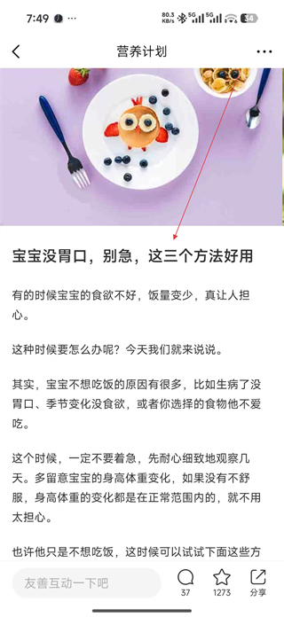 4、進入某一營養計劃的詳情頁,閱讀寶寶沒胃口的應對方法,了解寶寶食欲差的原因,學習觀察寶寶身體變化的方式,獲取對應的解決建議。