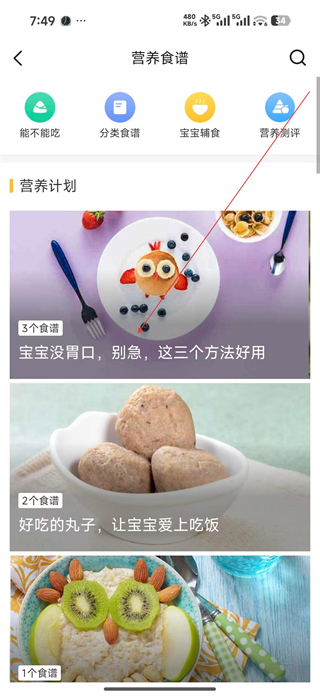 3、點擊食譜選項進入營養食譜頁面,查看能不能吃分類食譜等功能,瀏覽營養計劃下的食譜推薦,選擇適合寶寶的食譜內容查看詳情。
