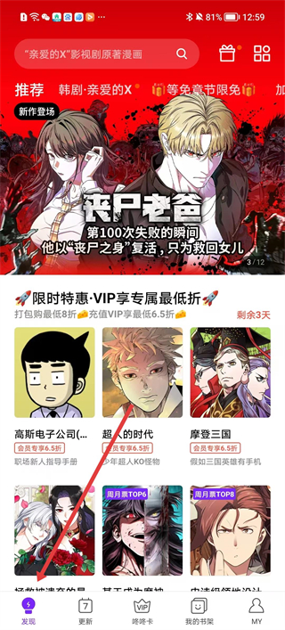1、打開咚漫漫畫app,進入發現頁面,可看到推薦、韓劇·親愛的X等分類,還有新作登場和限時特惠板塊,瀏覽各類漫畫推薦。
