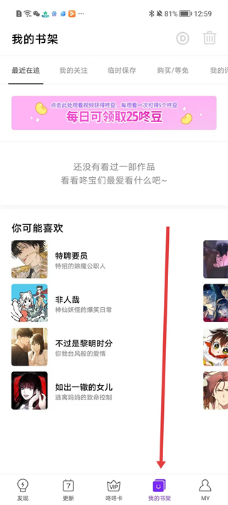 4、進入我的書架頁面可查看最近在追、我的關注等分類,管理已收藏的漫畫,還可查看你可能喜歡的漫畫推薦,發現新的漫畫作品。