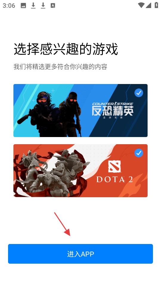 1、開啟APP后,于選擇感興趣的游戲頁面,勾選反恐精英、DOTA2等心儀游戲,點擊進入APP按鈕,進入應用主界面。