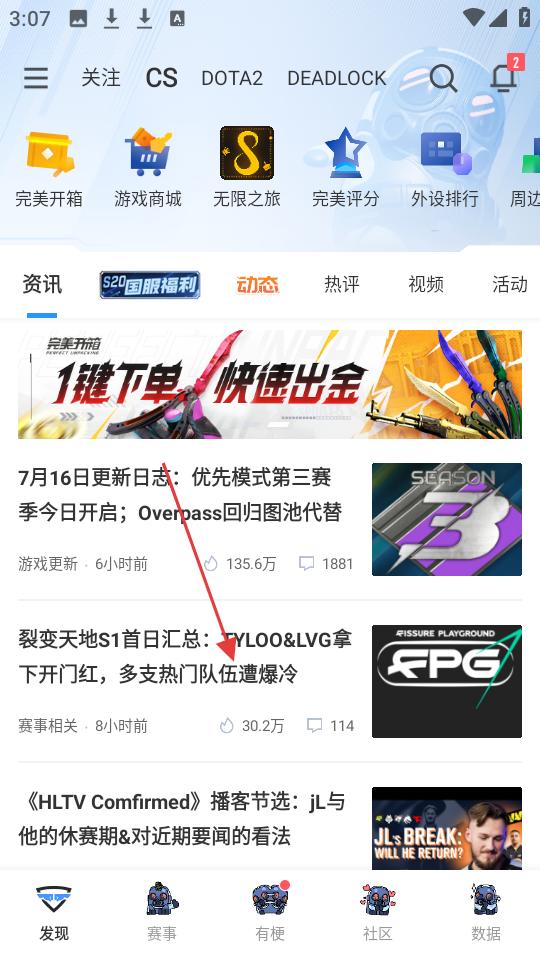 3、切換至發現頁面,瀏覽資訊動態欄,找到賽事更新、熱門戰隊資訊等內容,點擊感興趣的資訊標題,查看詳細游戲新聞與賽事報道。
