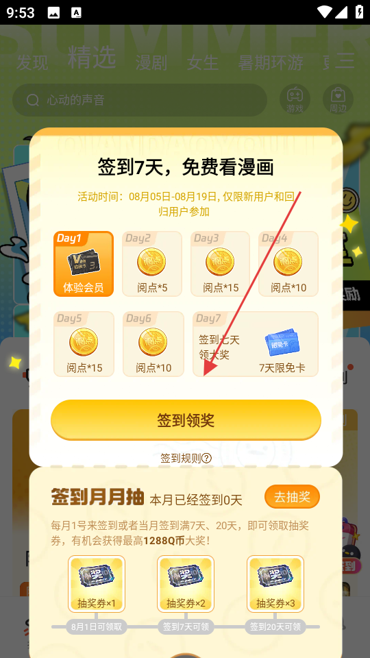 2、在簽到界面點擊簽到領獎,領取對應天數獎勵,如體驗會員、閱點等,參與簽到月抽活動。