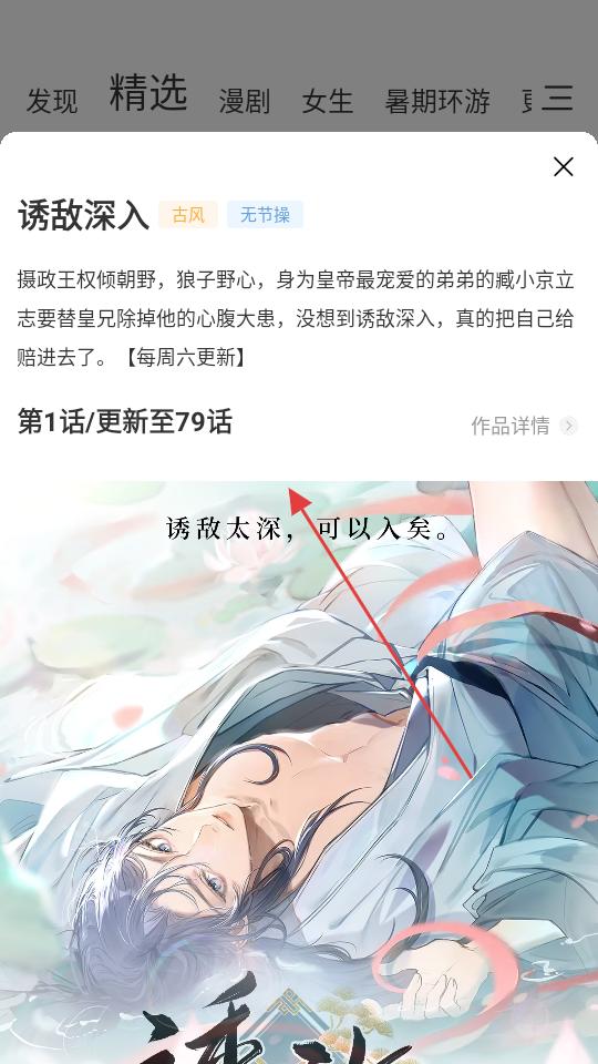 3、返回精選頁面,選擇感興趣的漫畫,點擊進入詳情頁,查看作品介紹、更新話數,開始閱讀漫畫內容。