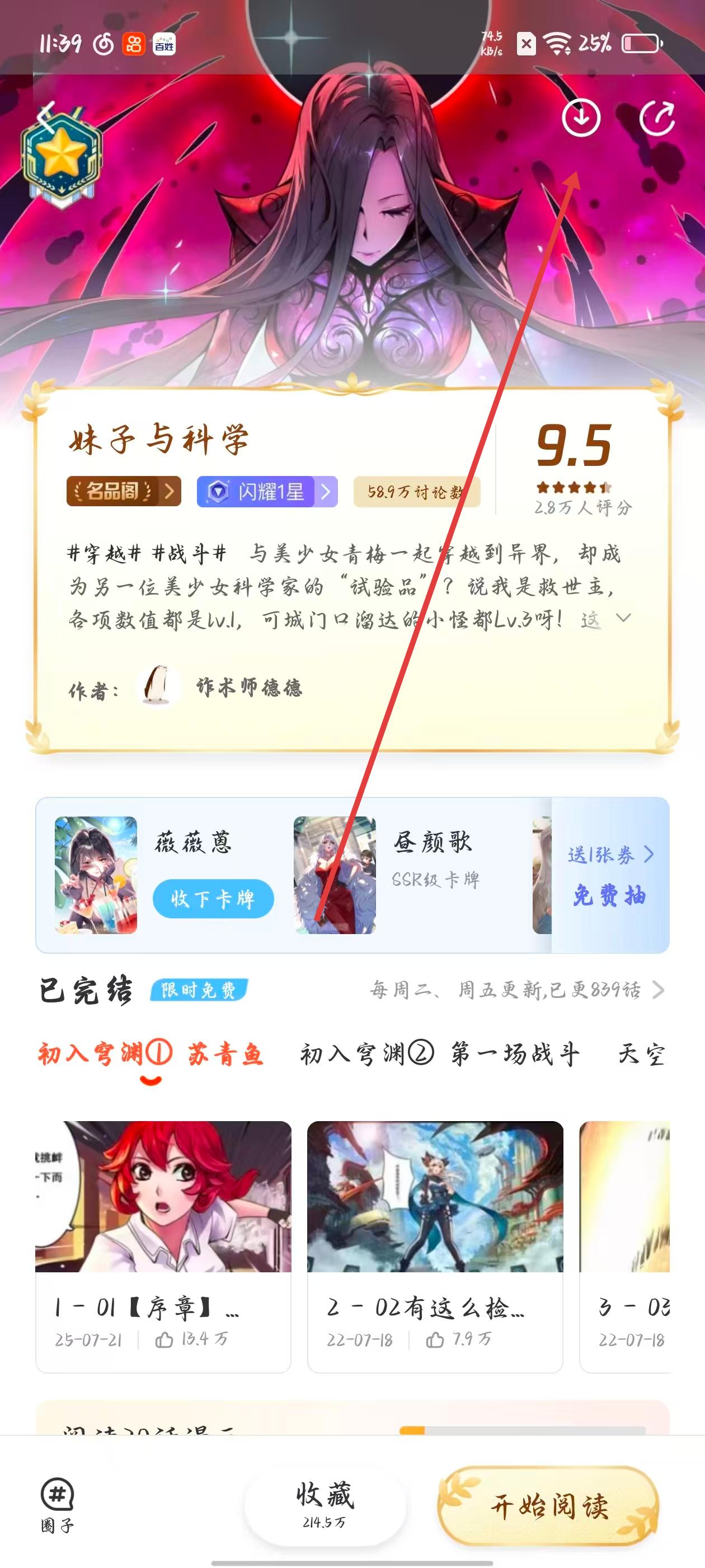 2、在妹子與科學詳情頁,點擊下載圖標,進入選擇下載章節頁面,選擇想要下載的漫畫章節。