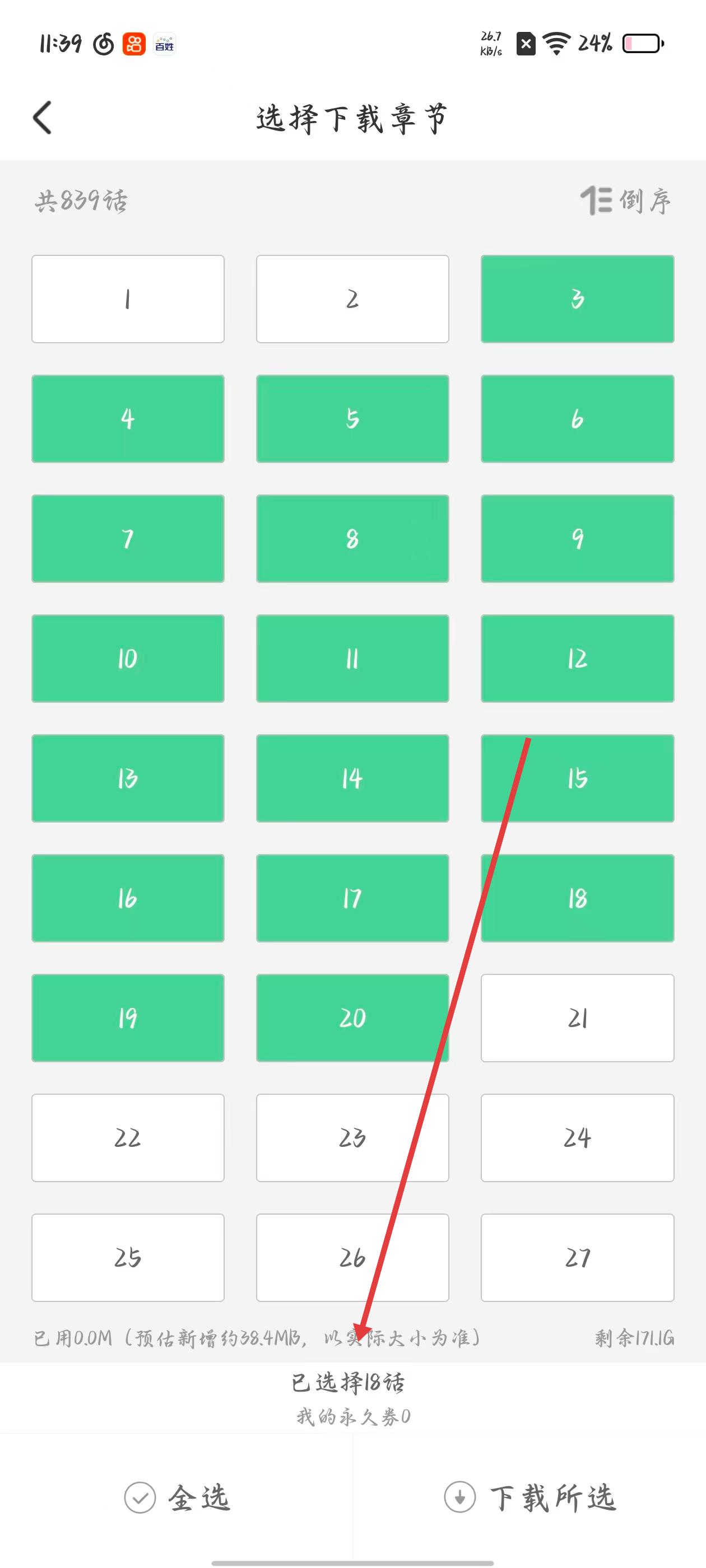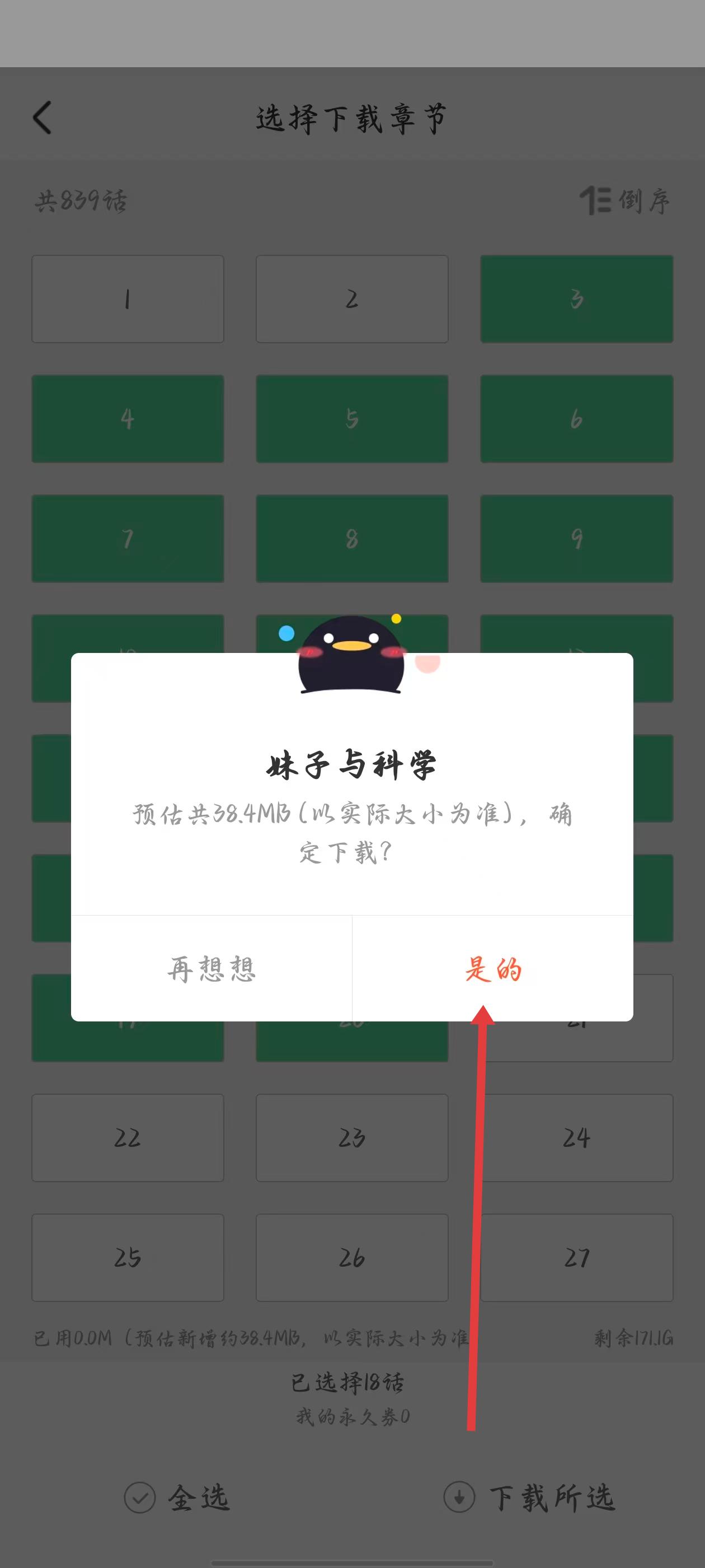 3、在選擇下載章節頁面,確認已選擇的18話章節,點擊下載所選,彈出預估大小確認框,準備確認下載。