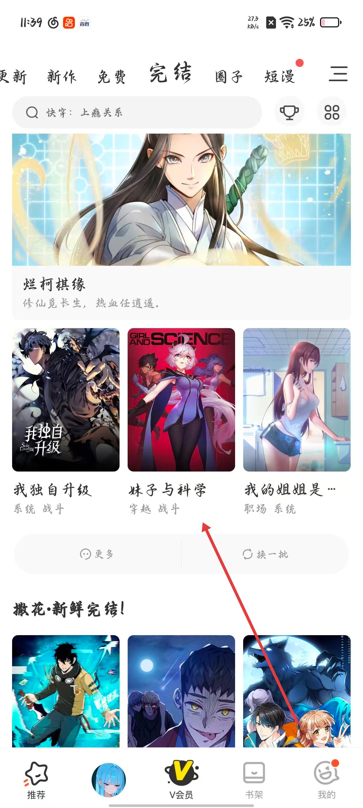 1、進入軟件推薦頁面,瀏覽更新、新作、完結等分類,選擇妹子與科學漫畫,進入詳情頁,查看漫畫評分、討論數及章節信息。