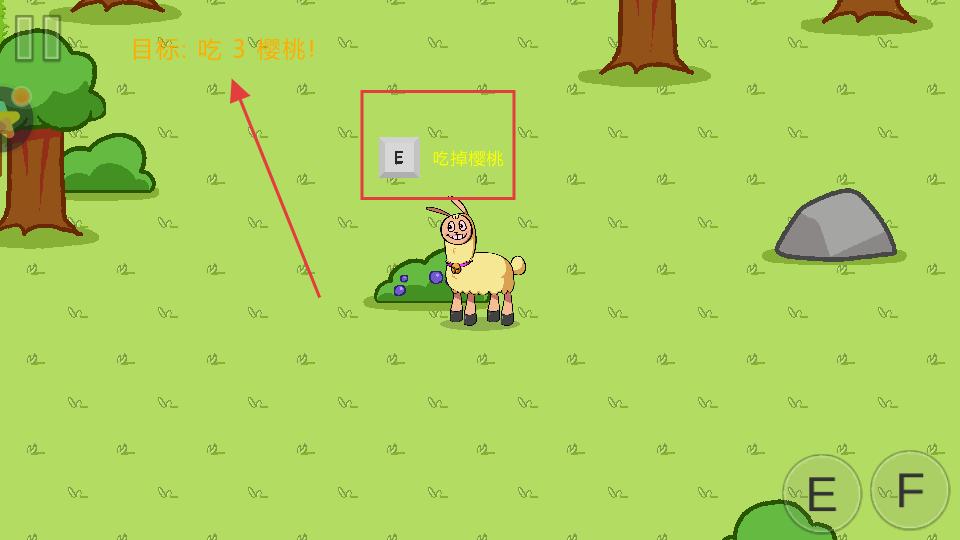 3、操控小羊在場景中移動,利用E、F等按鈕,與場景中的物體互動,尋找櫻桃等食物,推進覓食任務的進行。