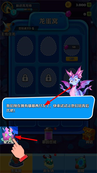 2、擁有雌雄兩只龍后,點擊愛之屋按鈕,進入培育后代的界面,準備讓兩只龍培育新的龍后代。