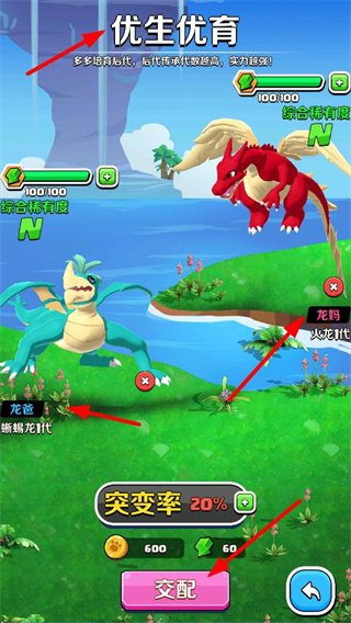 3、在優生優育界面,選擇要配對的龍,確認突變率后點擊按鈕,讓兩只龍培育后代,獲取新的龍蛋。